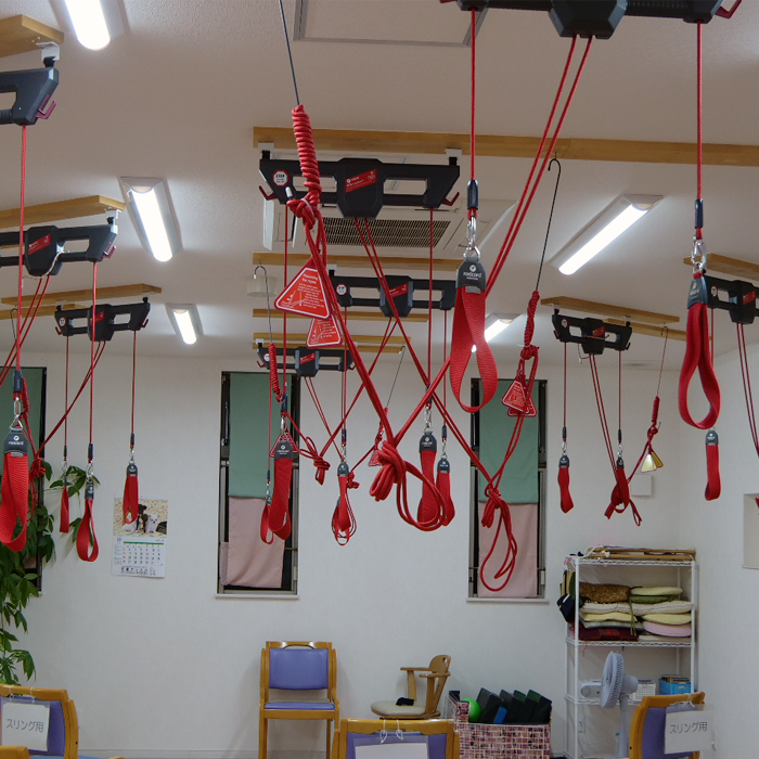 椅子に座り、天井から吊した紐(レッドコード)の輪に手や足を通して吊った状態で、体操を担当する職員が正面に座り、利用者様がその動きを模倣して全身的な運動を行ないます。腕、足ともに休憩を挟みつつ各10~15分程度のメニューを行ないます。その他にも週によってボールを使った足の運動や足を挙げて鈴を鳴らす運動もあります。