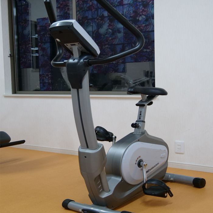 マシンの座面に座り、腕や足、体幹の動かせる範囲を引き出しながら筋力の維持向上を目的として行ないます。基本的に前後や左右の反復運動ですが、運動の速さや強さによってマシンの負荷が上下する仕組みとなり、使う方の筋力に合わせて怪我の危険性を抑えて行なえる事が長所です。職員が身体のどの部位に効果があるかを説明しながら各マシンで2~3分程度行ないます。